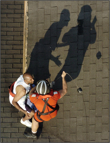 Coast Guard photojournalists were on the first aircraft flying into the city after landfall. The air crews that did not have photographers on board had hand-held video cameras and hoist cameras mounted to the airframe. This meant we were the first to get imagery of the response to both rescue planners and the public.