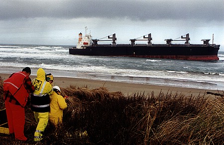 The New Carissa when it was still in one piece, hard aground off the coast of Coos Bay, Ore. February 1999. (image by the author)