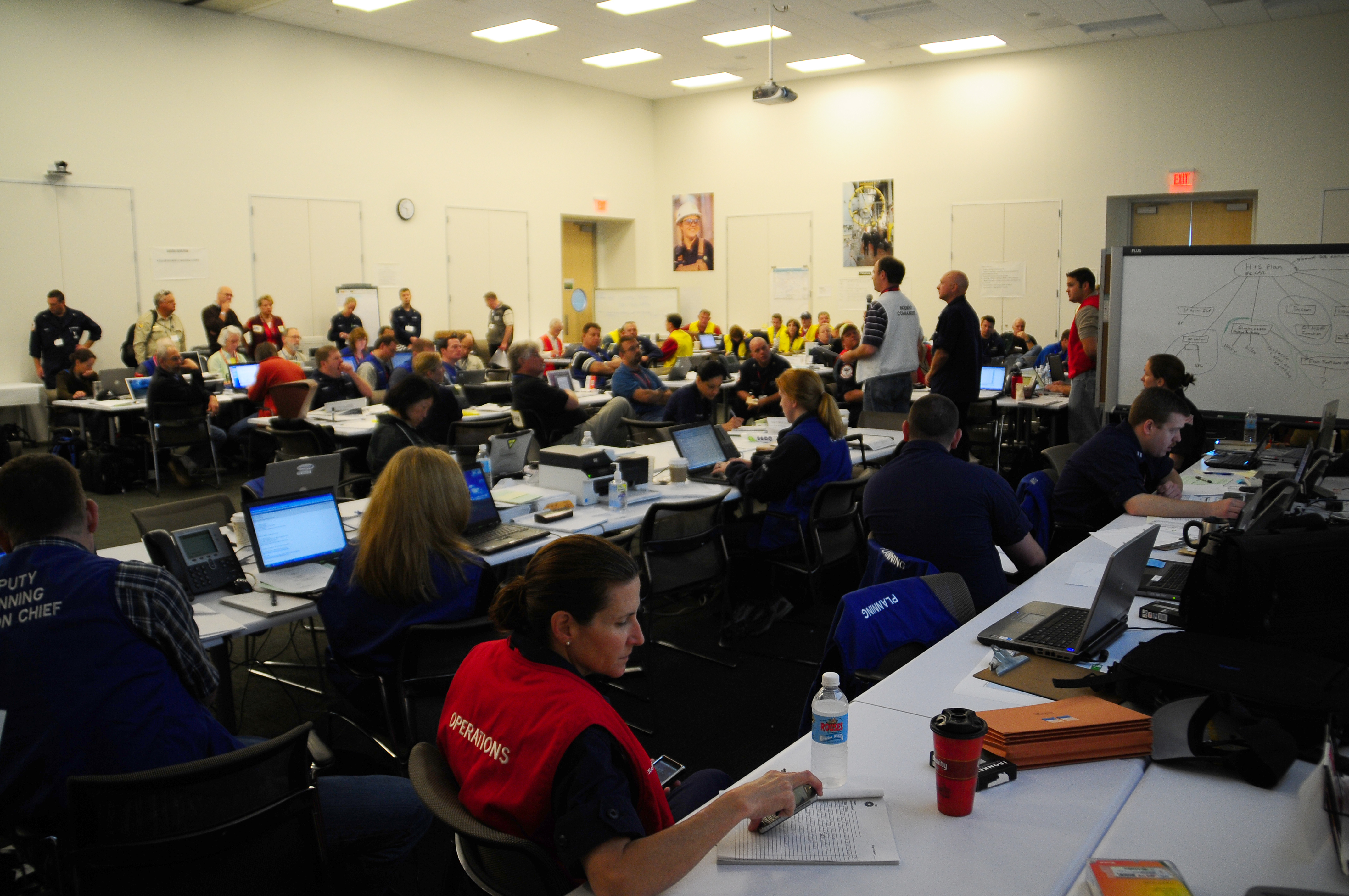 HOUMA, La. -- Members of the unified response for the Deepwater Horizon oil spill listen to the command members give an update at the unified command center in Houma, La. April, 25, 2010.  The command is made up of representatives of the U.S. Coast Guard, BP, the Marine Spill Response Corporation, National Response Corporation, National Oceananic and Atmospheric Administration, Louisiana Department Fish and Wildlife along with local, state and federal agencies.  U.S. Coast Guard photo by Petty Officer 3rd Class Stephen Lehmann.