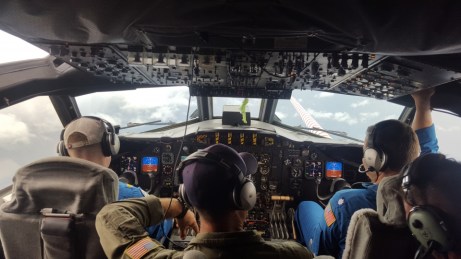 Photo: Lt. Kevin Doremus / NOAA Click for download, licensing and other information i NOAA Lockheed WP-3D Orion N42RF flight deck as seen during a flight into Hurricane Harvey on Aug. 24, 2017.