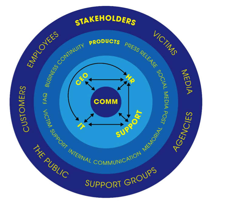 HR: If the crisis involves internal personnel being hurt or killed, HR will have their hands full, too, and will need to cooperate closely with COMM regarding what is happening, who is involved and how to inform colleagues about the situation.